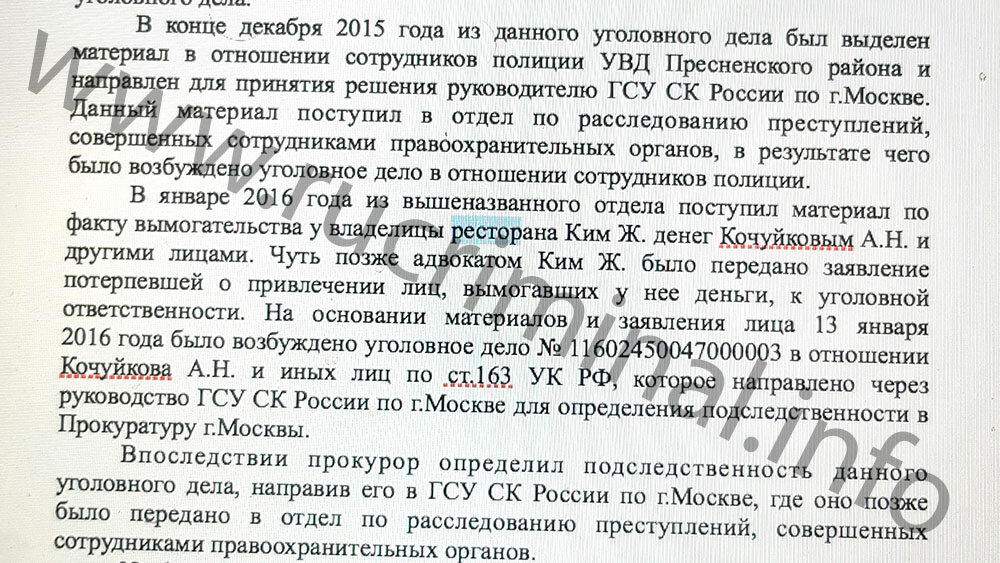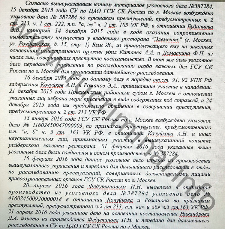 Итак, 16 декабря 2015 года. С момента перестрелки у ресторана «Элементс», в которой участвовали люди Эдуарда Буданцева и люди Андрея Кочуйкова, прошло немногим более суток. Буданцев еще находится под стражей (позже ему изберут меру пресечения в виде домашнего ареста), проходит его первый допрос. Адвокат подробно описывает события, произошедшие 14 декабря 2015 года (протокол допроса есть в распоряжении rucriminal.info). В частности, Буданцев так описывает, как ему пришлось поехать в «Элементс»: «14 декабря, примерно в 20 часов, мне на мобильный позвонил то ли Вячеслав, то ли Кенес, я их по голосам путаю». Звонивший и рассказал, что какие-то люди «наезжают» на владелицу ресторана «Элементс» Жанну Ким и ей требуется срочная помощь. Под Вячеславом подразумевается крупный казахский бизнесмен Вячеслав Ким (родственник Жанны, инвестор ресторана «Элементс»). Однако, в данном случае звонившим Буданцеву был все-же не он, а именно Кенес Ракишев (близкий приятель Жанны и тоже инвестор «Элементс»). О том, что адвокату звонил именно Ракишев следует, как из материалов «дела Буданцева», так и из материалов дела в отношении сотрудников полиции, обвинявшихся в том, что они не предотвратили перестрелку. По данным rucriminal.info, в этих делах присутствуют детализации телефонных соединений «трубок» Буданцева и Ким. Так, вот из этих детализаций следует, что, когда к Ким приехали люди Итальянца, она звонила по разным номерам, в том числе Кенесу Ракишеву. В свою очередь, Ракишев вскоре после этой беседы позвонил Буданцеву. И последний стал собираться в ресторан «Элементс». А вот соединений между телефоном Буданцева и телефоном Жанны нет. Более того, Ким до последнего не знала, кто приедет на ее защиту. Она записывала разговоры с вымогателями на диктофон, который не выключала. Из-за этого на записи (она присутствует в материалах дела и есть в распоряжении rucriminal.info) оказались беседы Жанны с людьми из ее команды, а также некоторые телефонные беседы (слышен голос только Ким). В одной из этих бесед она говорит: «Сейчас еще подлетят бойцы от шефа моего. Все нормально». Позже в другой беседе, Жанна уточняет, что это будут «люди Кенеса».