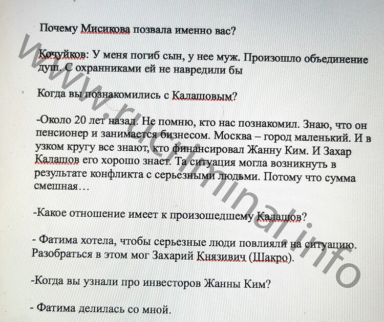 О том, что они стали жертвой провокации с участием Ракишева, полагают и сами Андрей Кочуйков и Захар Калашов. Итальянец во время дачи показаний на суде Жанной Ким (она делала это через видеотрансляцию, находясь за пределами РФ) заявил следующее: «Жанна, если вы будете на нас клеветать, я назову ваших инвесторов. Один — это родственник, а второй — это тот, который послал Буданцева». Под последним человеком (пославшим Буданцева) Кочуйков подразумевал Ракишева. Также Итальянец, выступая на слушаниях, сообщил следующее: «С Калашовым я познакомился около 20 лет назад. Не помню, кто нас познакомил. Знаю, что он пенсионер и занимается бизнесом. Москва – город маленький. И в узком кругу все знают, кто финансировал Жанну Ким. И Захар Калашов его хорошо знает. Та ситуация могла возникнуть в результате конфликта с серьезными людьми. Потому что сумма смешная…Фатима хотела, чтобы серьезные люди повлияли на ситуацию. Разобраться в этом мог Захарий Князивич (Шакро)».