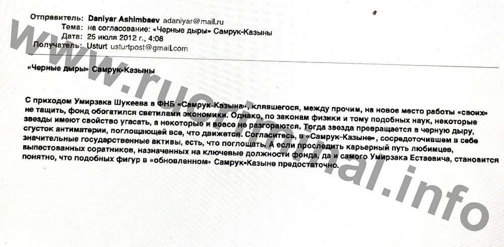 При этом, Ашимбаев также заказывает, а затем публикует материалы негативного характера и о личных противниках Кулибаева и Ракишева из числа представителей казахстанской правящей элиты. Например, 25 июля 2012 года Ашимбаев отправил на согласование материал «Черные дыры» Самрук-Казына», в котором негативно характеризуется деятельность Умирзака Шукеева, который сменил Тимура Кулибаева на посту председателя правления государственного фонда народного благосостояния «Самрук-Казына».
