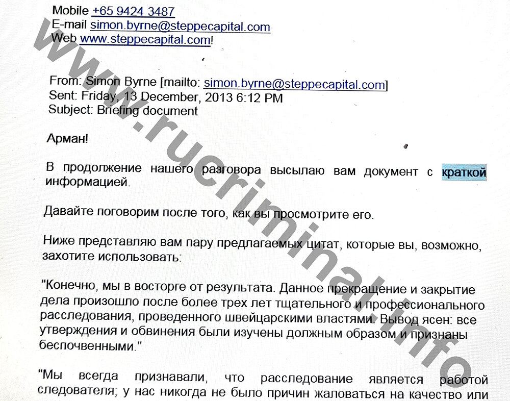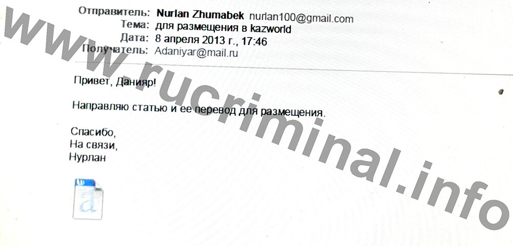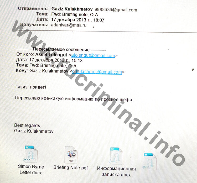 В него были вложены материалы для публикации на тему прекращения властями Швейцарии расследования против Кулибаева. Судя по содержанию письма, вышеупомянутые материалы были получены пользователем «Gaziz Kulakhmetov» от пользователя «Assel Tolengut» с ящика «atolengut@gmail.com».