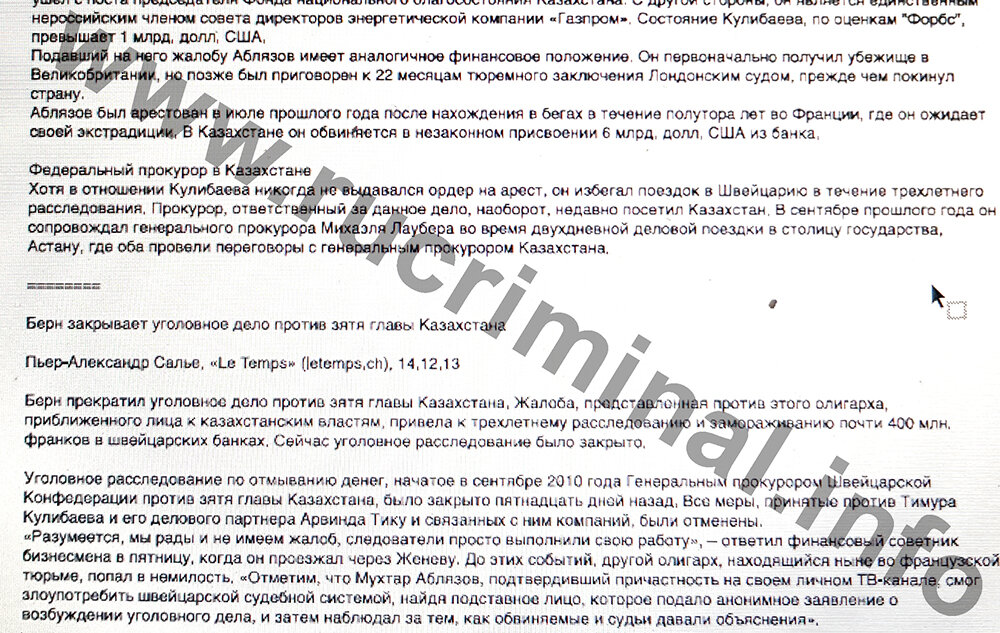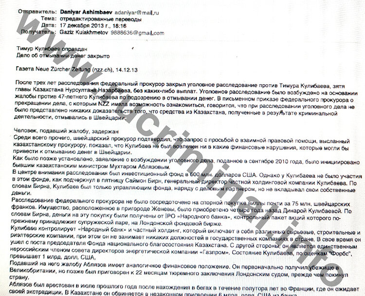 Через несколько минут после получения вышеупомянутого письма, Ашимбаев со своего ящика «adaniyar@mail.ru» отправил пользователю «Gaziz Kulakhmetov» на ящик «9888636@mail.com» от- редактированные тексты двух переводов, озаглавленных «Тимур Кулибаев оправдан. Дело об отмывании денег закрыто» и «Берн закрывает уголовное дело против зятя главы Казахстана» .Из последнего письма мы узнаем названия газет, в которых размещались заказные материалы по Кулибаеву- Neue Zurcher Zeitung и Le Temps.