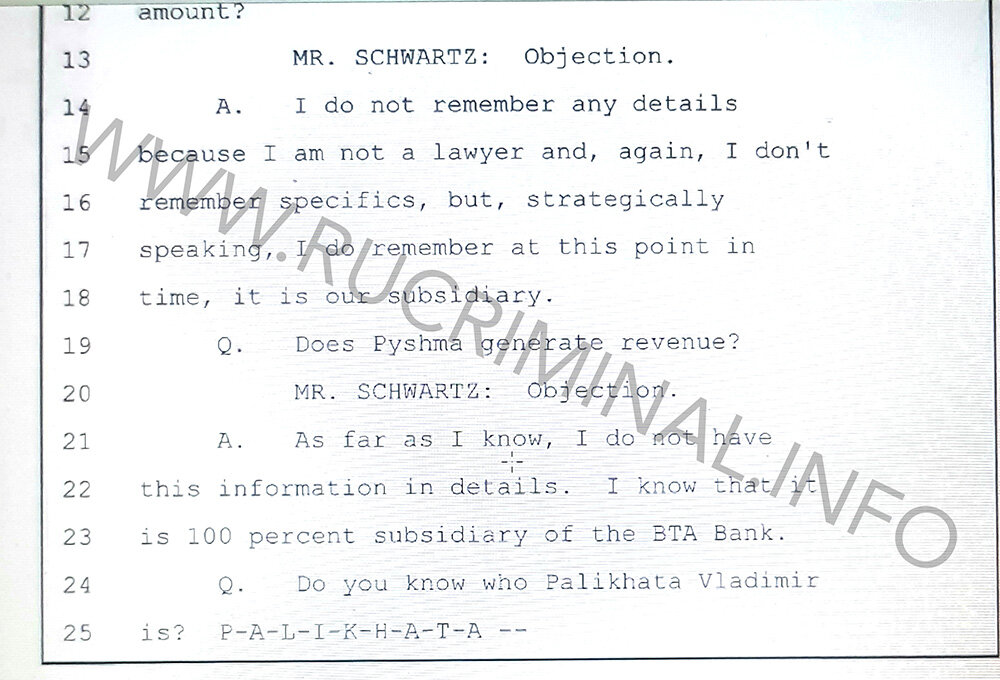 МИСТЕР. SCHWARTZ: Возражение. Он сказал, что не знает деталей. Он здесь не как представитель БТА Банка.