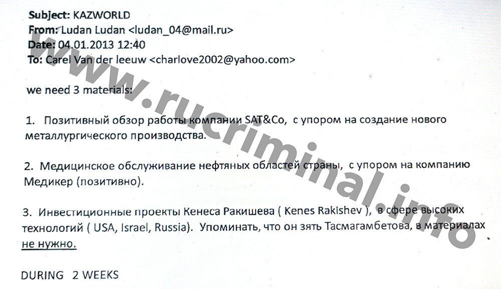 Получив задания от Рактшева, Ашимбаев перепоручает их различным журналистам, в том числе некому автору под ником «Ludan Ludan» и иностранному автору по имени Чарлз. Для переписки с Чарльзом «Ludan Ludan» использует ящик «ludan_04@mail.ru», а «Чарльз» или «Carel Van der leeuw» – ящик «charlove2002@yahoo.com». 4 января 2013 года «Ludan Ludan» отправила «Carel Van der leeuw» письмо, в котором заказала на английском языке три материала.