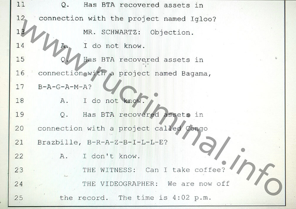 Q. Не могли бы вы обратиться к странице, имеющей штамп 1197. Что делает BTA по возвращению активов в связи с проекта Igloo?