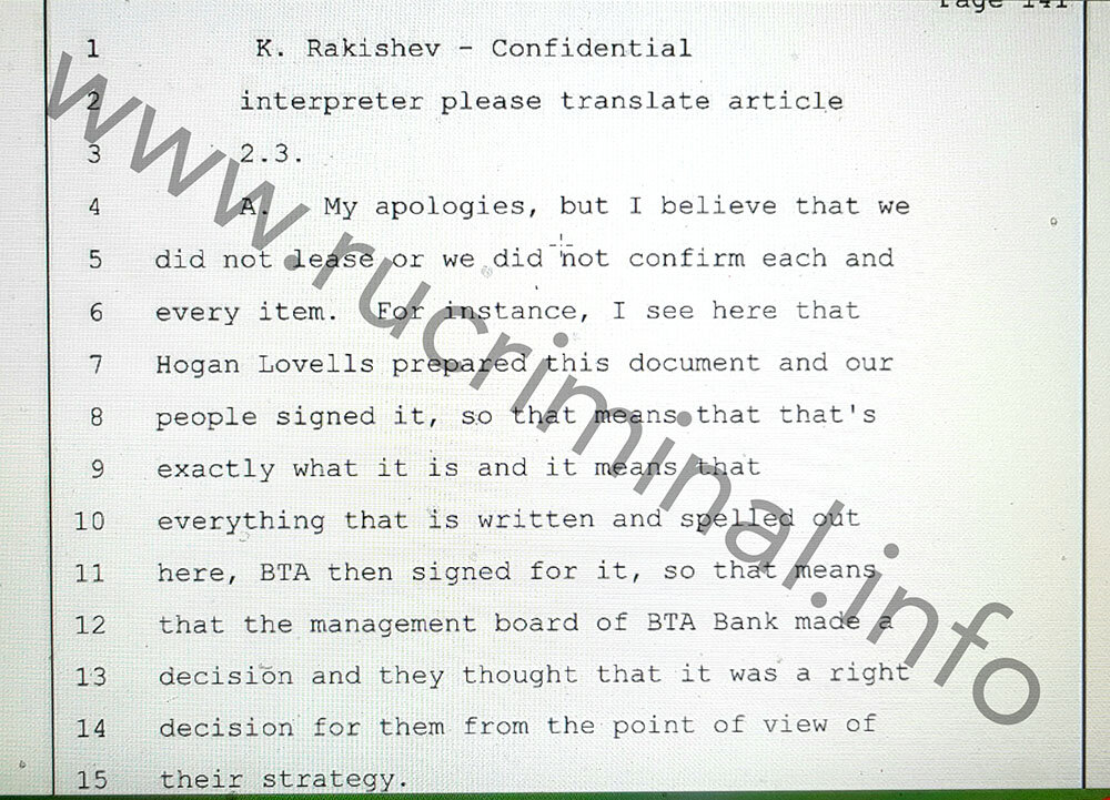Р. Мои извинения, но я не считаю нужным подтверждать каждую деталь. Например, я вижу здесь , что Hogan Lovells подготовил этот документ и наш сотрудник подписал его, так что это так и есть. Все, что здесь написано подписал БТА, это означает , что правлением банка БТА было принято соответствующее решение. Правление думало , что это правильное решение с точки зрения стратегии.
