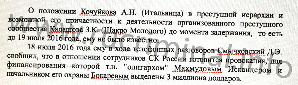 Итак, 18 июля 2016 года. Ровно через сутки генерал СКР Михаил Максименко будет задержан. У сотрудников СКР все «рушится». Несмотря на полученные 1,5 млн долларов (деньги передавали «решальщики» Олег Шейхаметов и Дмитрий Смычковский), они не смогли освободить из СИЗО «авторитета» Андрея Кочуйкова. Тот мигом вновь был задержан сотрудниками ФСБ РФ. Более того, контрразведчики явно знают, что сотрудникам СКР выплатили огромную взятку и «копают» в данном направление. У «заговорщиков» начинается легкая паника. 15 июля отмечалось день рождение генерала СКР Михаила Максименко, но особой радости на празднике не было. Через три дня с ним связывается Дмитрий Смычковский, который уже находится за рубежом. Этот «решальщик» знает множество министров, миллиардеров, представителей криминального мира и генералов. Обычно в его деятельности промашек не бывает. А в случае с Кочуйковым вышла полная катастрофа. Согласно материалам дела, оказавшимся в распоряжении rucriminal.info, Смычковский , проведя собственную разведку, так объясняет Максименко причины провала: Искандер Махмудов и Андрей Бокарев выделили 3 миллиона долларов на «провокации» в отношении «вора в законе» Захара Калашова и сотрудников СКР. Именно, из-за этого не удалось «без шума и пыли» вытащить Итальянца на свободу. Максименко внимательно относится к данной информации и записывает ее. Позже эти записи при обыске у генерала нашли сотрудники ФСБ РФ. На допросе Максименко и пояснил, что конспектировал беседу со Смычковским. Впрочем, потом генерал перестал давать какие-либо показания. А у Смычковского не спросишь- он сбежал из России и находится в розыске.