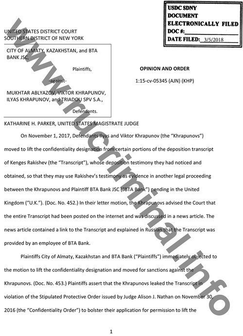 rucriminal.info finished publishing Kenes Rakishev’s testimony in a US court, where BTA-bank’s lawsuit against former bank owner Mukhtar Ablyazov, former head of the capital of Kazakhstan, Viktor Khrapunov and his son Ilyas Khrapunov, was examined. But the hearings of the Kazakh oligarch were not over. The editors have at their disposal a new batch of court documents, which we are currently studying. In one of them we are talking about the testimony of Rakishev and how he tried to block their distribution.