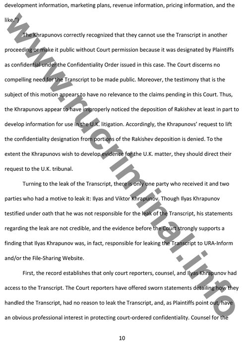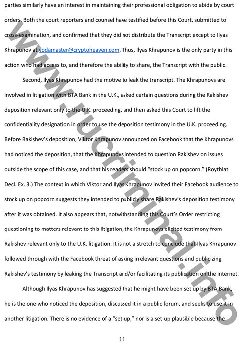 According to the document that rucriminal.info has at its disposal, after interrogation of Rakishev, Magna created and distributed the initial rough transcript of the testimony of Rakishev. On October 16, 2017, Khrapunov’s lawyer received a copy of the transcript from Magna by e-mail. On October 17, 2017, the lawyer of Khrapunov sent an e-mail a copy of the transcript to the Claimant and asked Plaintiffs to make confidentiality marks on the part of Rakishev’s testimony, so that the Khrapunovs could use this testimony during a lawsuit in the UK. On October 26, 2017, a copy of the Transcript was uploaded to a file sharing website. fex.Net, after which it leaked to the Internet …