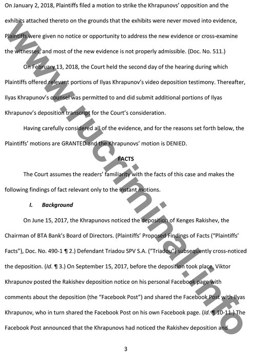 On June 15, 2017, Khrapunovs learned about the scheduled interrogation of Kenes Rakishev, Chairman of the Board of Directors of BTA Bank. (Doc. No. 490-1. Defendant Triadou SPV SA (Triad)). On September 15, 2017, before the interrogation was conducted, Viktor Khrapunov published a post about the upcoming interrogation of Rakishev on his personal Facebook page with comments and shared it with Facebook in Ilya Post
