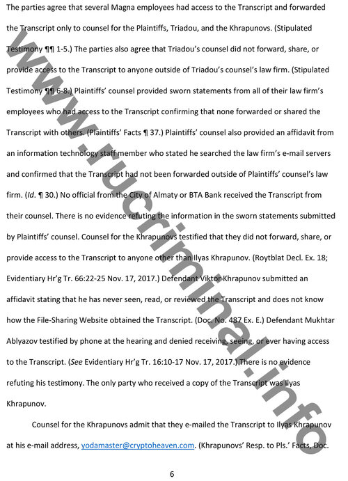 The plaintiffs conducted an investigation to determine the source of the leak. The parties agree that several Magna employees had access to the Transcript and forwarded the Transcript to the Plaintiffs, the Triad and the Hrapunovs. The parties also agree that Triad’s lawyer did not share the transcript with anyone who is outside the Triad lawyer’s law firm. … No official from Almaty or BTA Bank received a transcript from
