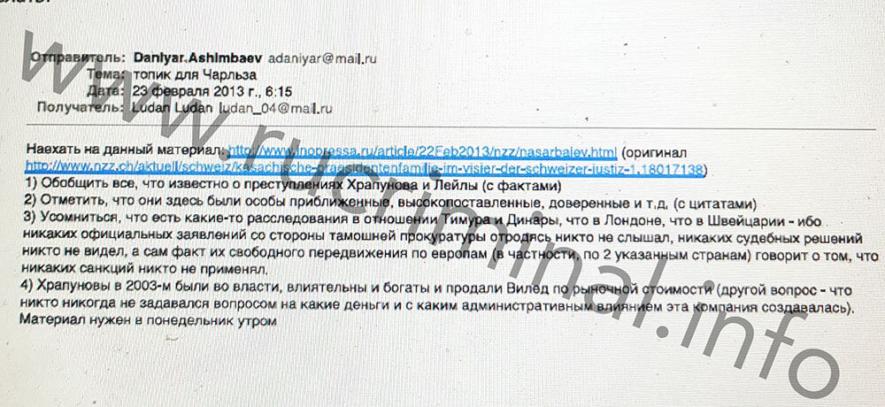For example, on February 23, 2013, Ashimbaev sent a letter to “Ludan Ludan” marked “topic for Charles”, in which he instructed “to run over this material” and explained how this should be done.