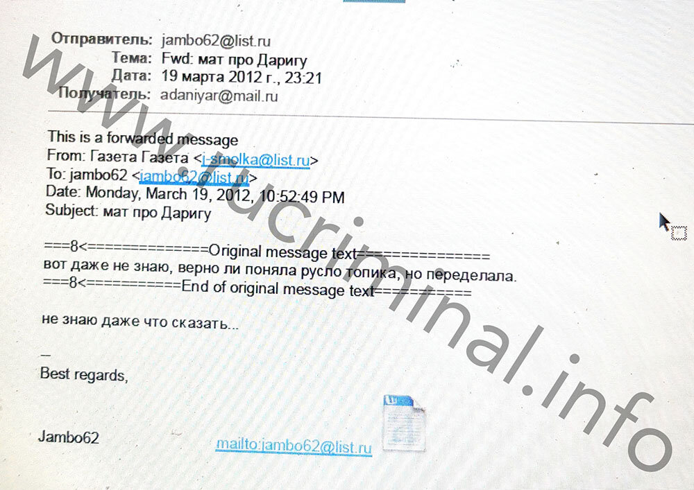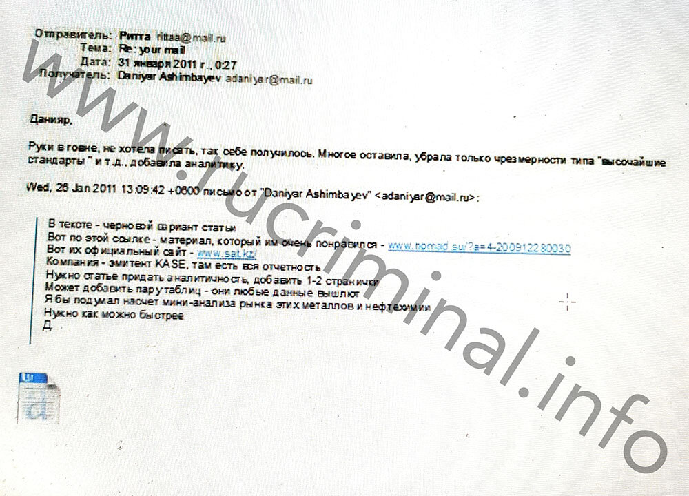There were cases when Ashimbaev employees complained that they had to write advertising materials in the interests of Rakishev’s SAT & Company. So, on January 30, 2011, the user “rittaa” from the “rittaa@mail.ru” mailbox sent Ashimbaeva to the adaniyar@mail.ru address a draft article in which she said that the material turned out to be so-so, because “hands are in shit”.