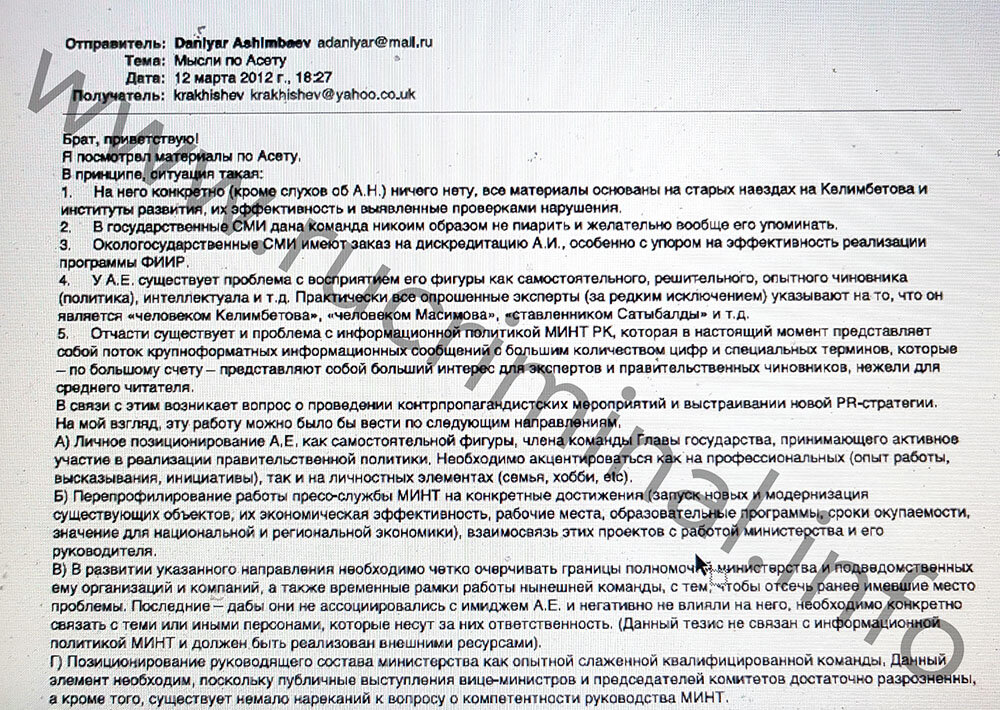 As can be seen from the correspondence between Rakishev and Ashimbaev, the latter fulfills Rakishev’s instructions regarding image support for various people. For example, on March 12, 2012, Ashimbaev sent to Rakishev his proposals on a PR program for Asset Issekeshev, then vice-premier of the Kazakh government and minister of industry and new technologies.