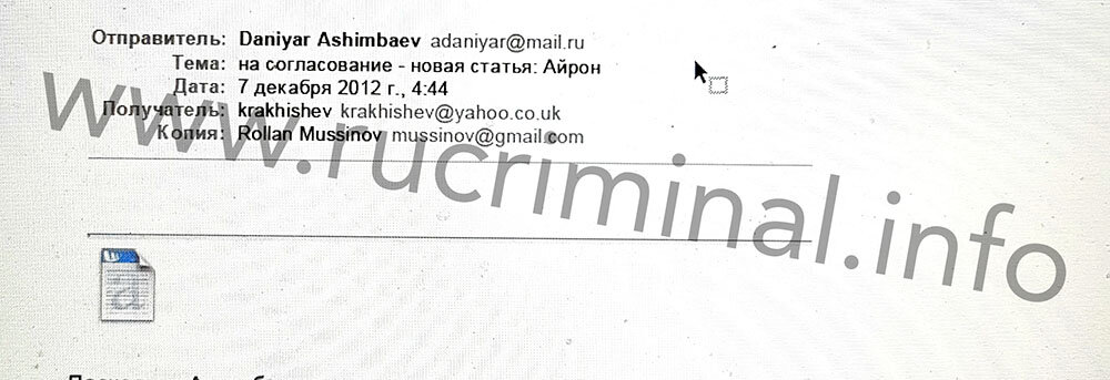 Judging by the letter of Ashimbaev to Rakishev dated March 12, 2012, sent from the box “adaniyar@mail.ru” to the address “krakhishev@yahoo.co.uk” Ashimbaeva and Isekesheva were introduced by Rakishev. In this letter, Ashimbaev expresses his