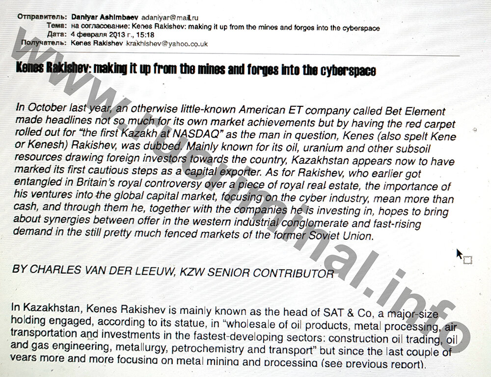 On February 4, 2013, Ashimbaev sent for approval to Rakishev promotional material in English called “Kenes Rakishev: making it up from mines and forges into cyberspace”.