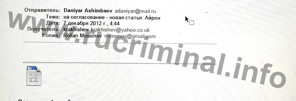 On December 6, 2012, Ashimbaev sent Rakishev to agree on the text of the Iron-Man publication in Russian about SAT & Company.