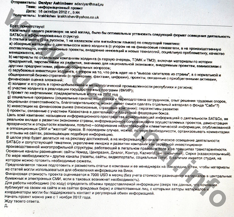 In all this history it is interesting also another. Well would block resources asked man far from” black ” PR. However, it is available rucriminal.info there were documents that Rakishev himself is an active player in the market for the placement of custom materials in the Russian and foreign press. Moreover, this material is not only praising Rakishev, but also muddy his opponents and just do not like people, for example, the daughter of President Nazarbayev Dariga. On how prepared the “impact” in the media to Dariga rucriminal.info will tell soon. In the meantime, let’s return to the investigation on how Rakishev through Daniyar Ashimbayev (staff PR-schik “top” of Kazakhstan) deals with “enemies” and praises himself.