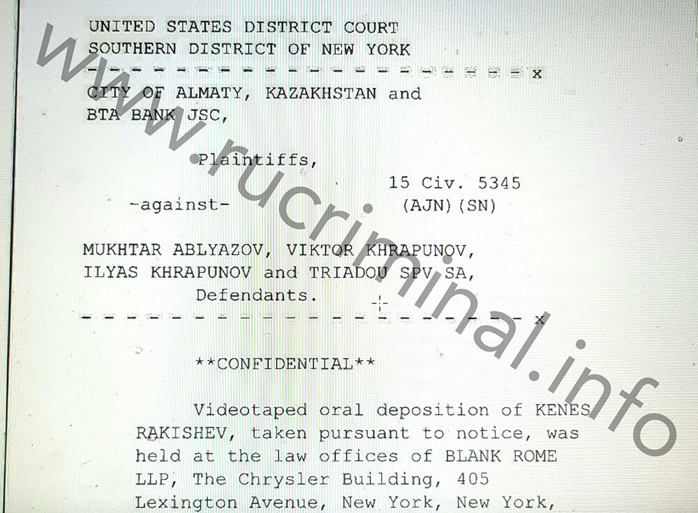 rucriminal.info continues a series of articles about the American testimony of Kazakh oligarch Kenes Rakishev. They were voiced by Rakishev in the US court, where the lawsuit of BTA Bank was examined against the former owner of the bank Mukhtar Ablyazov, the former head of the capital of Kazakhstan Viktor Khrapunov and his son Ilyas Khrapunov. The lawyers of the latter tried to prove at the trial that Rakishev was only the nominal owner of BTA Bank. In reality, the bank is controlled by people from the “top” of Kazakhstan and these people are behind the persecution of Ablyazovan and Khrapunovs. The names of these people from the “top”, with whom Rakishev personally communicates, were voiced. Kenes himself the fact of close communication directly with them or their representatives. This is the head of the KNB Karim Masimov, the son-in-law of the head of Kazakhstan Timur Kulibayev and personally Nursultan Nazarbayev. All these names are in the records of the interrogation of Rakishev, a certified copy of which was at the disposal of rucriminal.info. Asked about the specific activities of the BTA Bank, where Rakishev was the chairman of the board of directors at the time of the interrogation, he responds to the bank’s assets in one, “I do not know.” During the hearing, it turned out that BTA has interests in the Congo and Sudan. Also, that in reality a significant part of the allegedly stolen assets was not returned by the bank for free, but bought back. rucriminal.info publishes a transcript of this part of the interrogation.